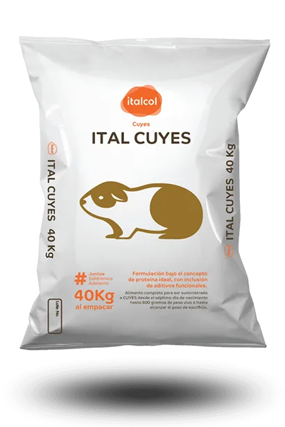 Italcol Cuyes es un alimento peletizado de alta digestibilidad que ofrece una nutrición completa para todas las etapas productivas. Contiene aminoácidos esenciales (lisinas y metionina) para el crecimiento muscular, ácidos grasos que mejoran la carne y el bienestar, vitamina C para fortalecer el sistema inmune, y minerales como calcio, fósforo, zinc, selenio para huevos fuertes y defensas óptimas. Aporta la energía necesaria para un crecimiento rápido, uniforme y un excelente rendimiento productivo.